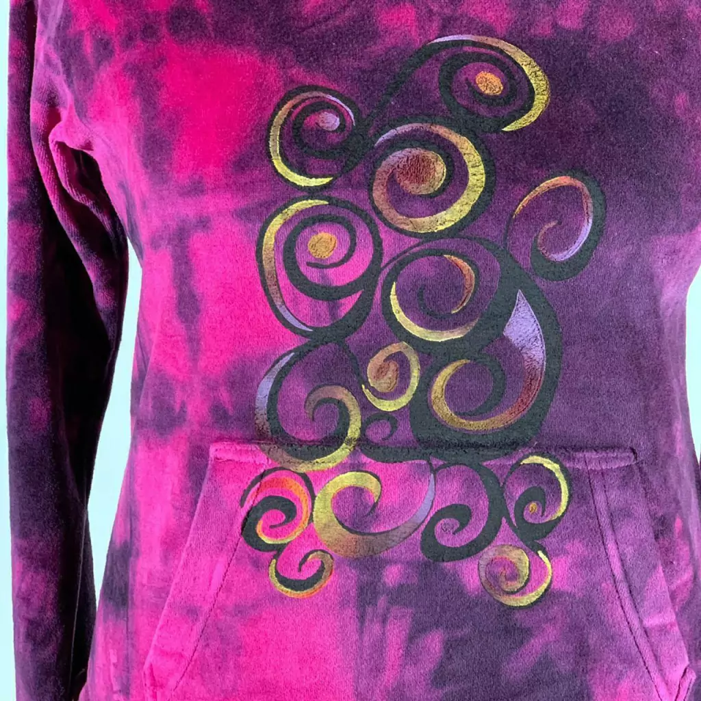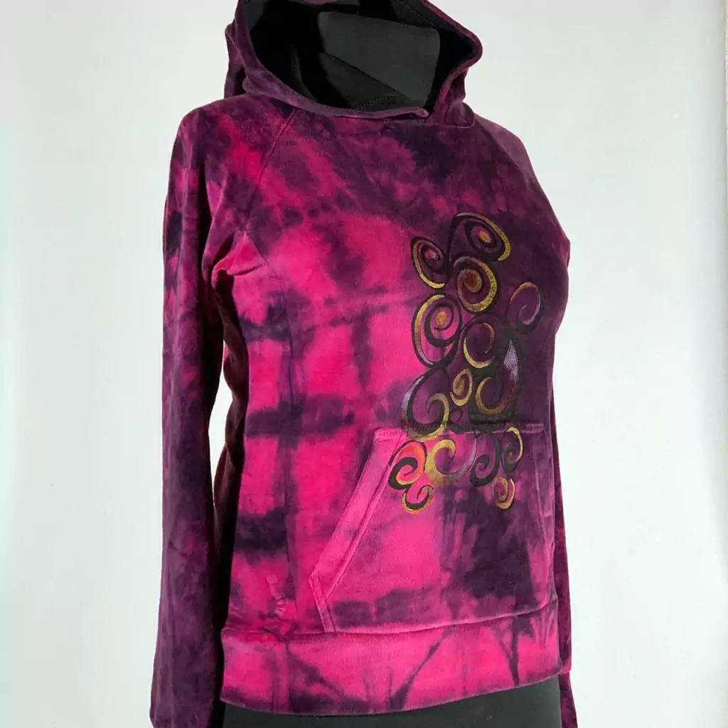 Buzo de Plush con capucha y bolsillo delantero tipo canguro. Pintado a mano y en los casos de batik también están teñidos a mano.