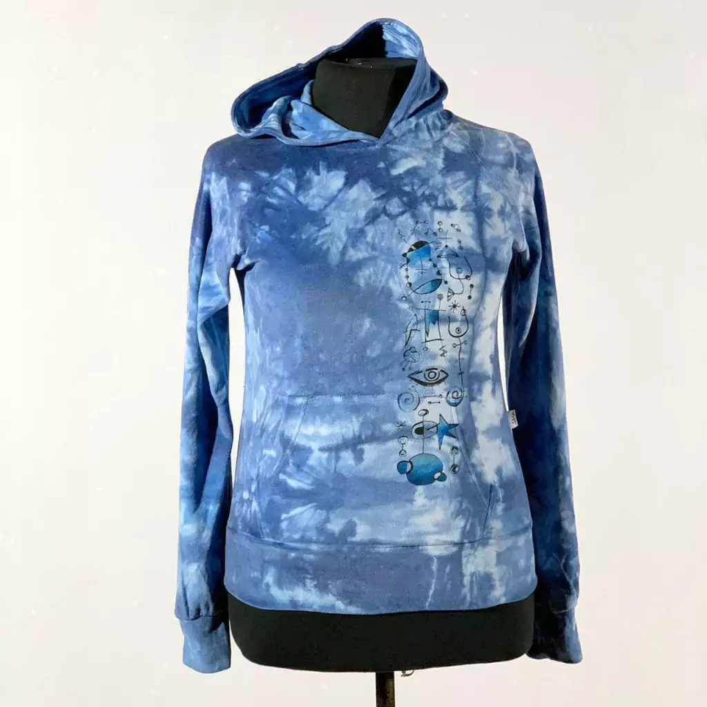 Buzo de towel con capucha y bolsillo delantero tipo canguro. Pintado a mano y en los casos de batik también están teñidos a mano.