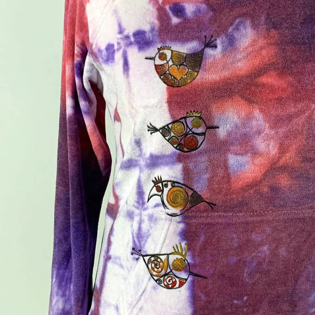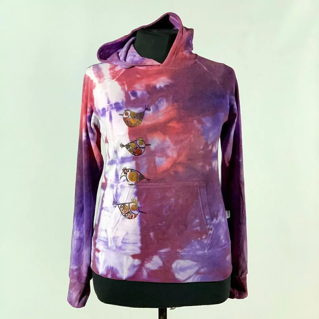 Buzo de towel con capucha y bolsillo delantero tipo canguro. Pintado a mano y en los casos de batik también están teñidos a mano.