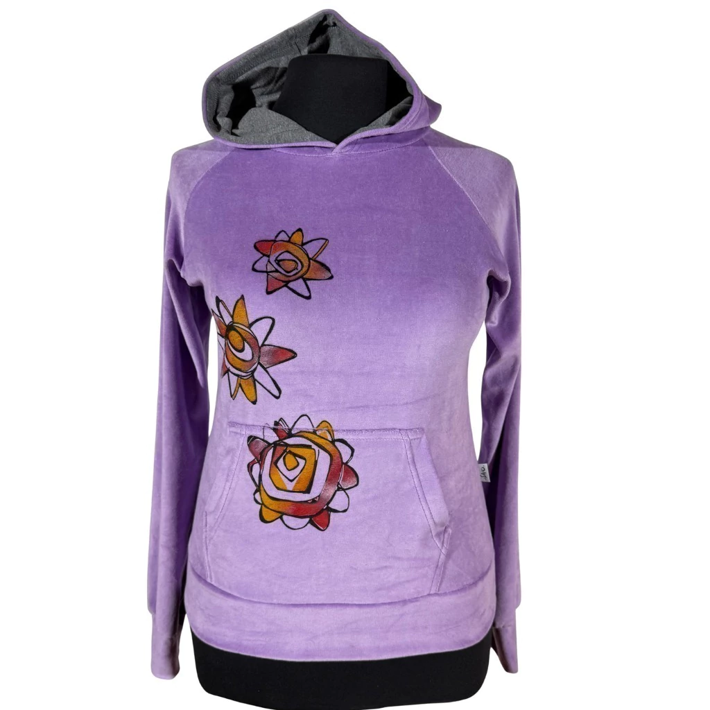 Buzo de Plush con capucha y bolsillo delantero tipo canguro. Pintado a mano y en los casos de batik también están teñidos a mano.