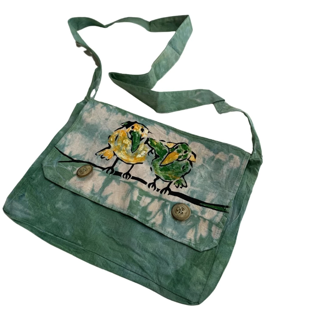 Cartera tipo morral de lienzo pintada a mano.