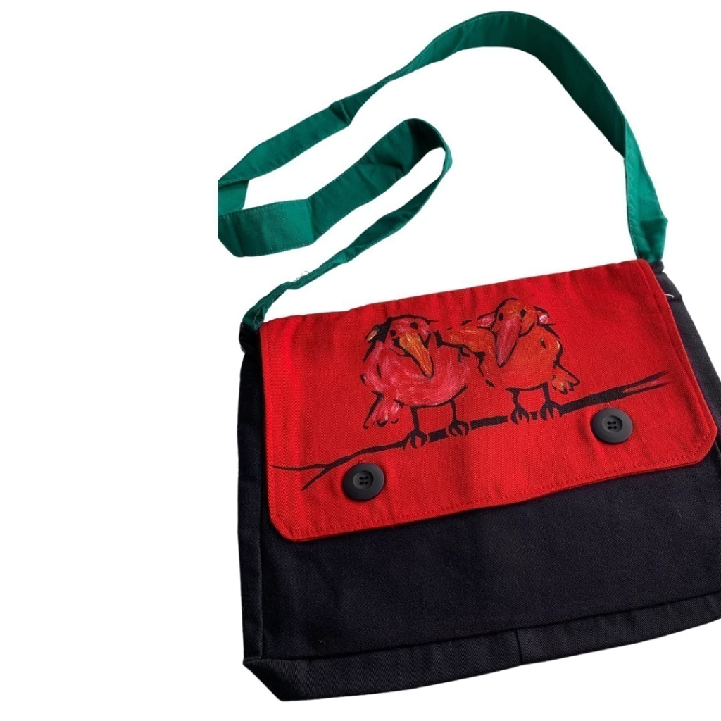 Cartera tipo morral de lienzo pintada a mano.