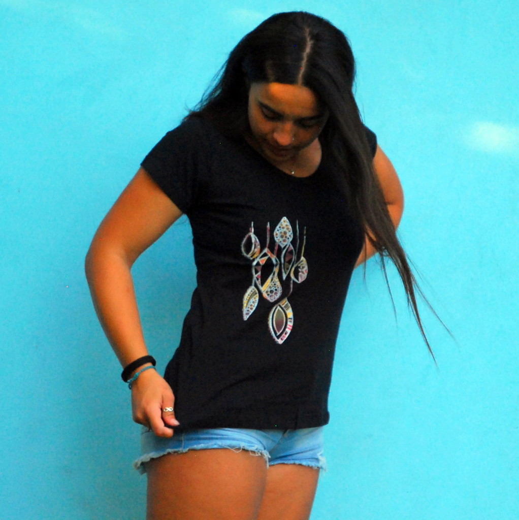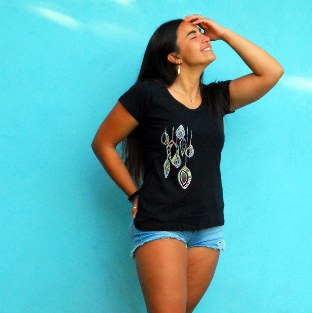 Remera 100% algodón estampada a mano con serigrafía y pintada con stencil.