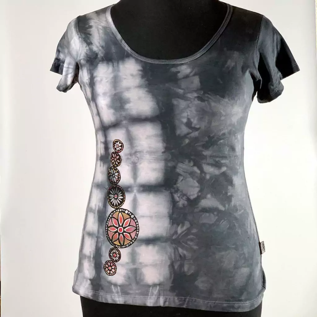 Remera 100% algodón estampada a mano con serigrafía y pintada con stencil.