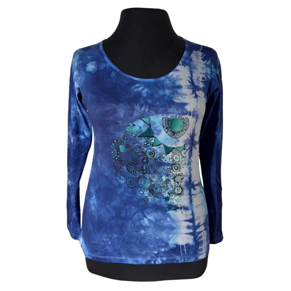 Estampada con serigrafía y pintada a mano con stencil. En algunos casos esta teñida con batik!