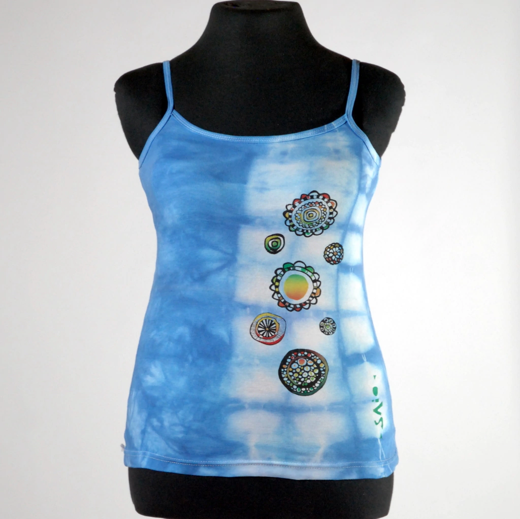 Musculosa de rib estampada con serigrafía y pintada a mano con stencil. En los casos de batik también están teñidas a mano.