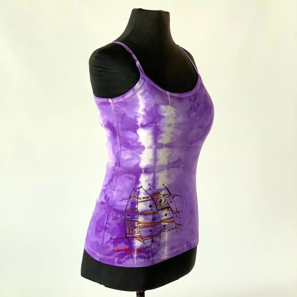 Musculosa de rib estampada con serigrafía y pintada a mano con stencil. En los casos de batik también están teñidas a mano.