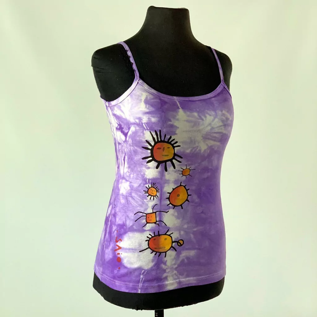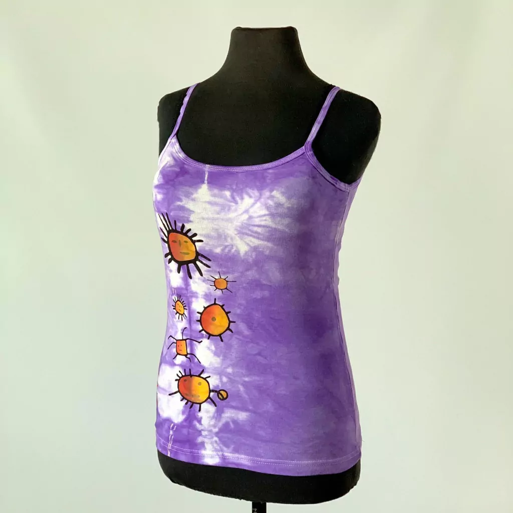 Musculosa de rib estampada con serigrafía y pintada a mano con stencil. En los casos de batik también están teñidas a mano.