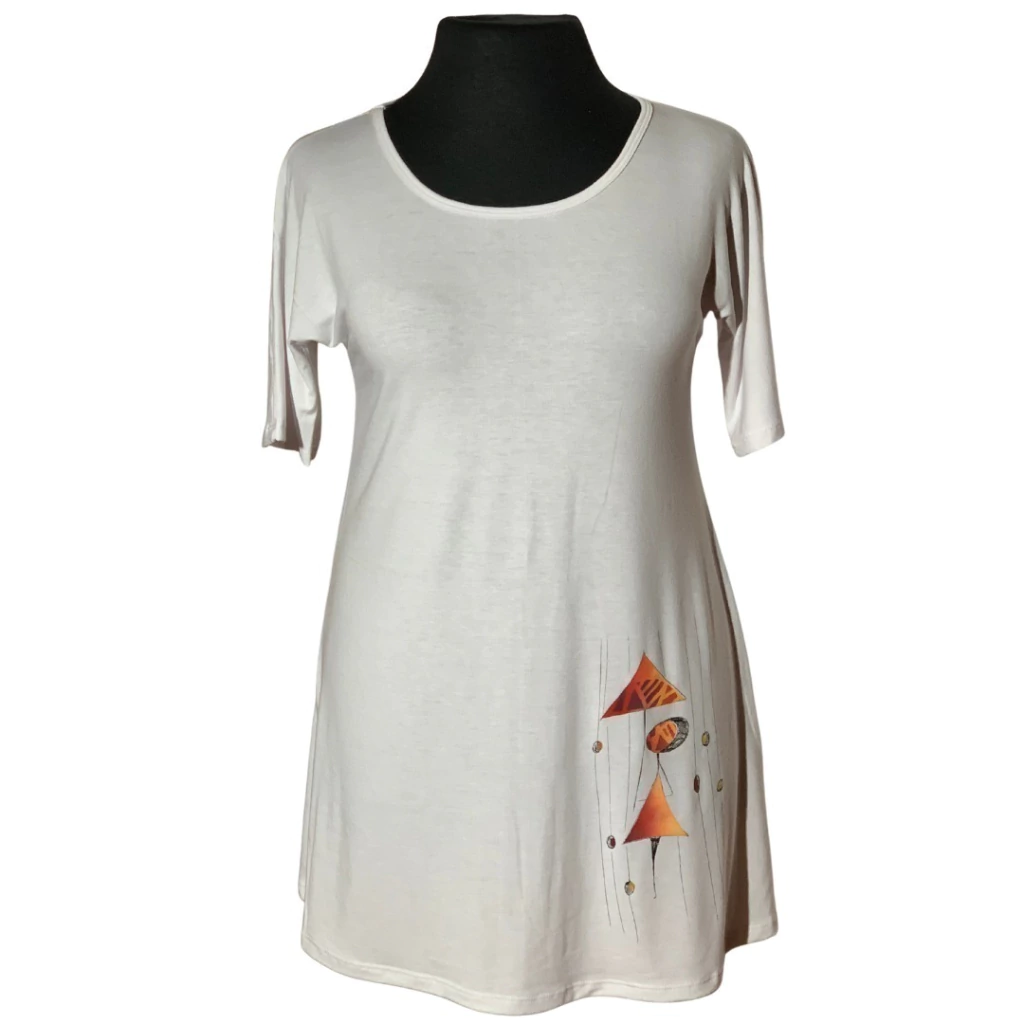 Modal con lycra. Pintado a mano con stencil y serigrafia. En los casos de Batik también estan teñidos a mano.